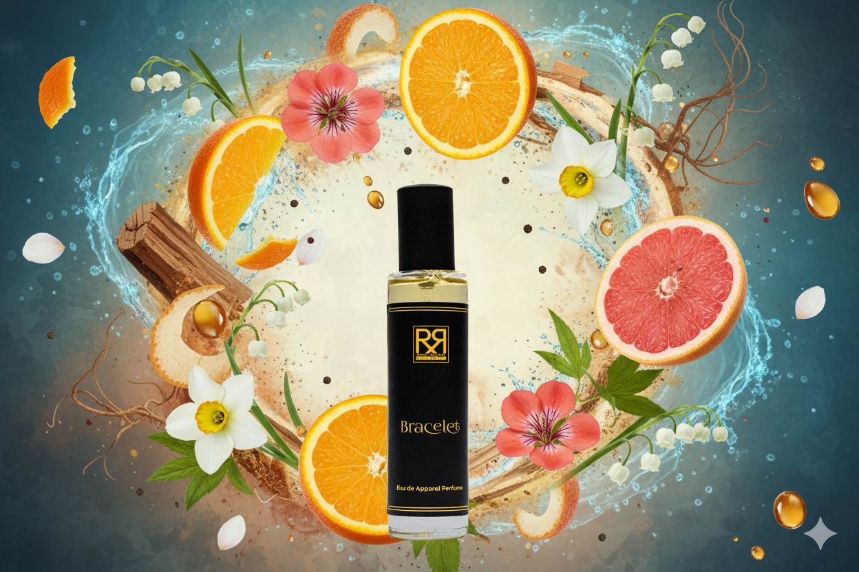 Bracelet opens with a fresh, zesty burst of orange and grapefruit, enhanced by a crisp aquatic accord, evoking the sensation of a cool sea breeze on sunlit shores. The heart brings forward a bright bouquet of white florals narcissus and lily of the valley adding an elegant floral clarity and soft aromatic spiciness from geranium and pepper, which provides liveliness without overpowering.